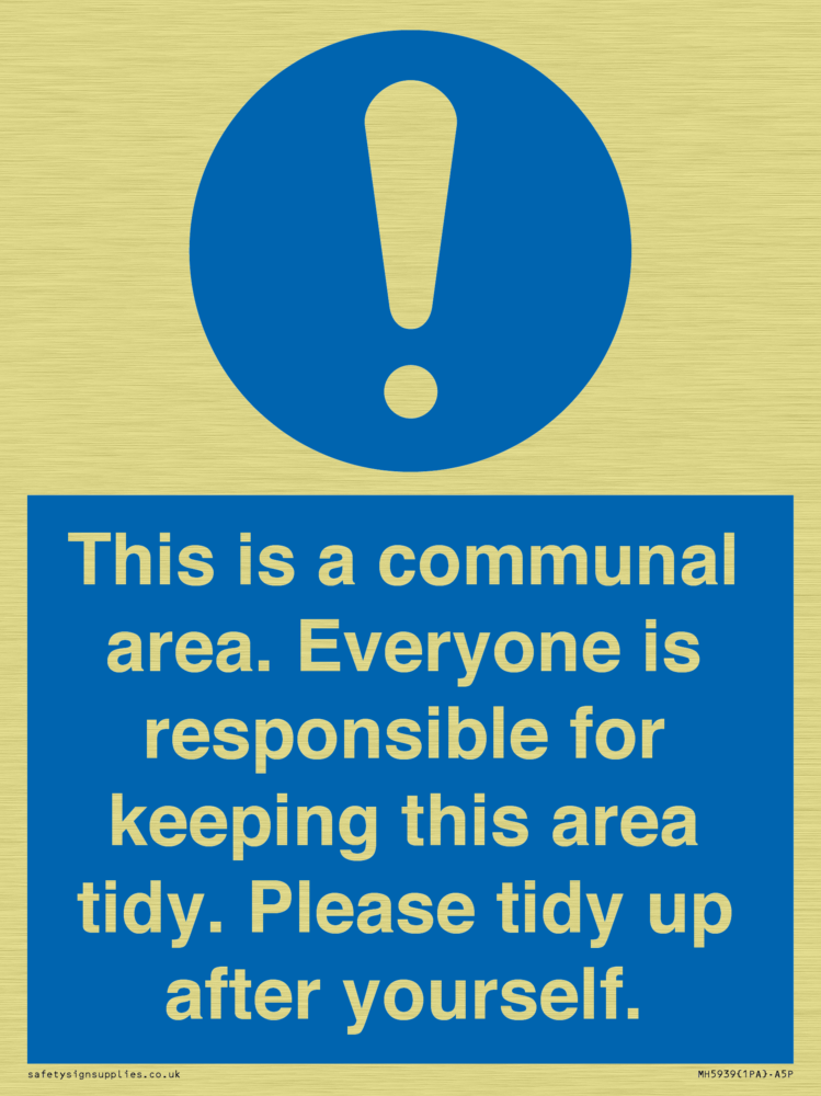 Sign Text: This is a communal area. Everyone is responsible for keeping this area tidy. Please tidy up after yourself.