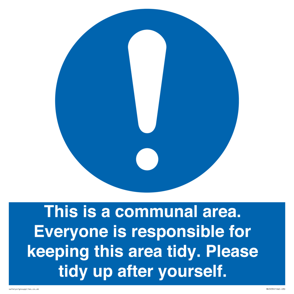 Sign Text: This is a communal area. Everyone is responsible for keeping this area tidy. Please tidy up after yourself.