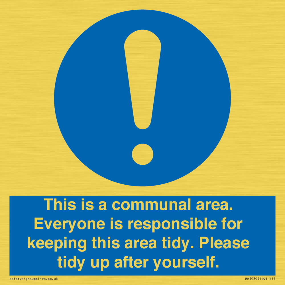 Sign Text: This is a communal area. Everyone is responsible for keeping this area tidy. Please tidy up after yourself.