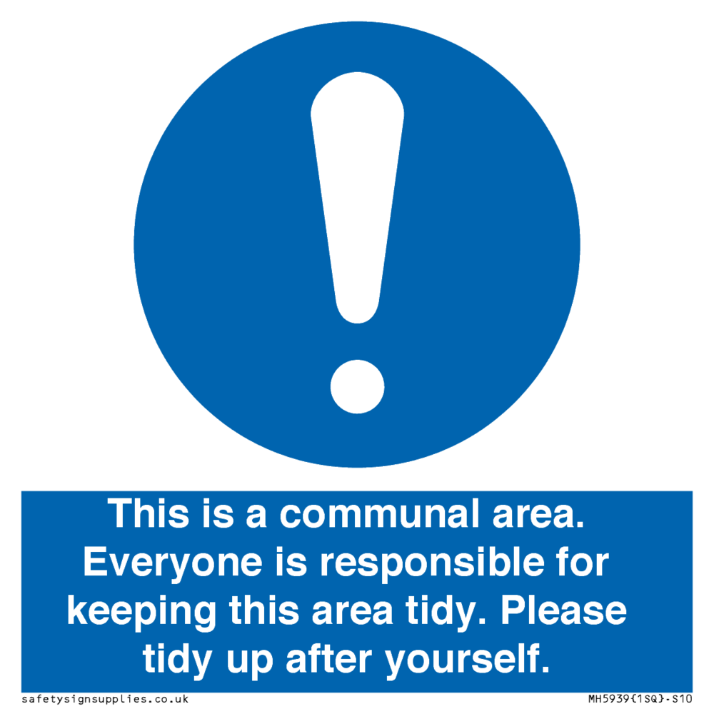 Sign Text: This is a communal area. Everyone is responsible for keeping this area tidy. Please tidy up after yourself.