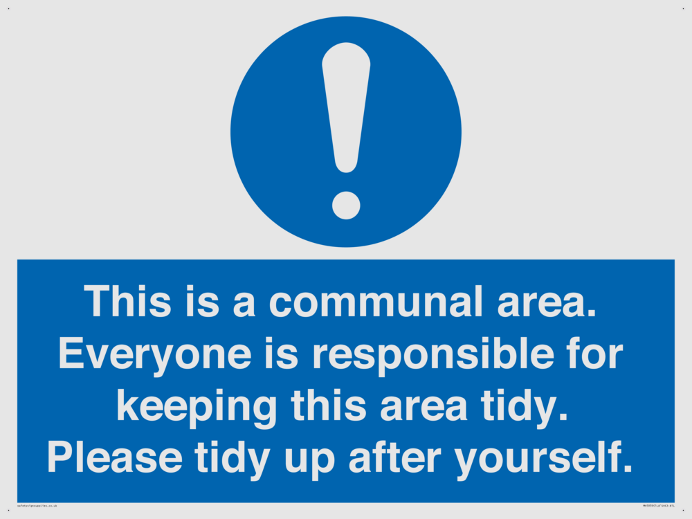 Sign Text: This is a communal area. Everyone is responsible for keeping this area tidy. Please tidy up after yourself.