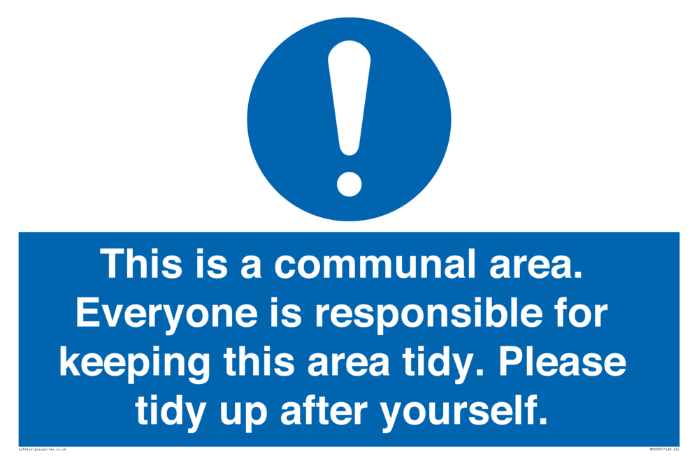 Sign Text: This is a communal area. Everyone is responsible for keeping this area tidy. Please tidy up after yourself.