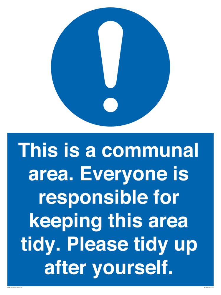 Sign Text: This is a communal area. Everyone is responsible for keeping this area tidy. Please tidy up after yourself.