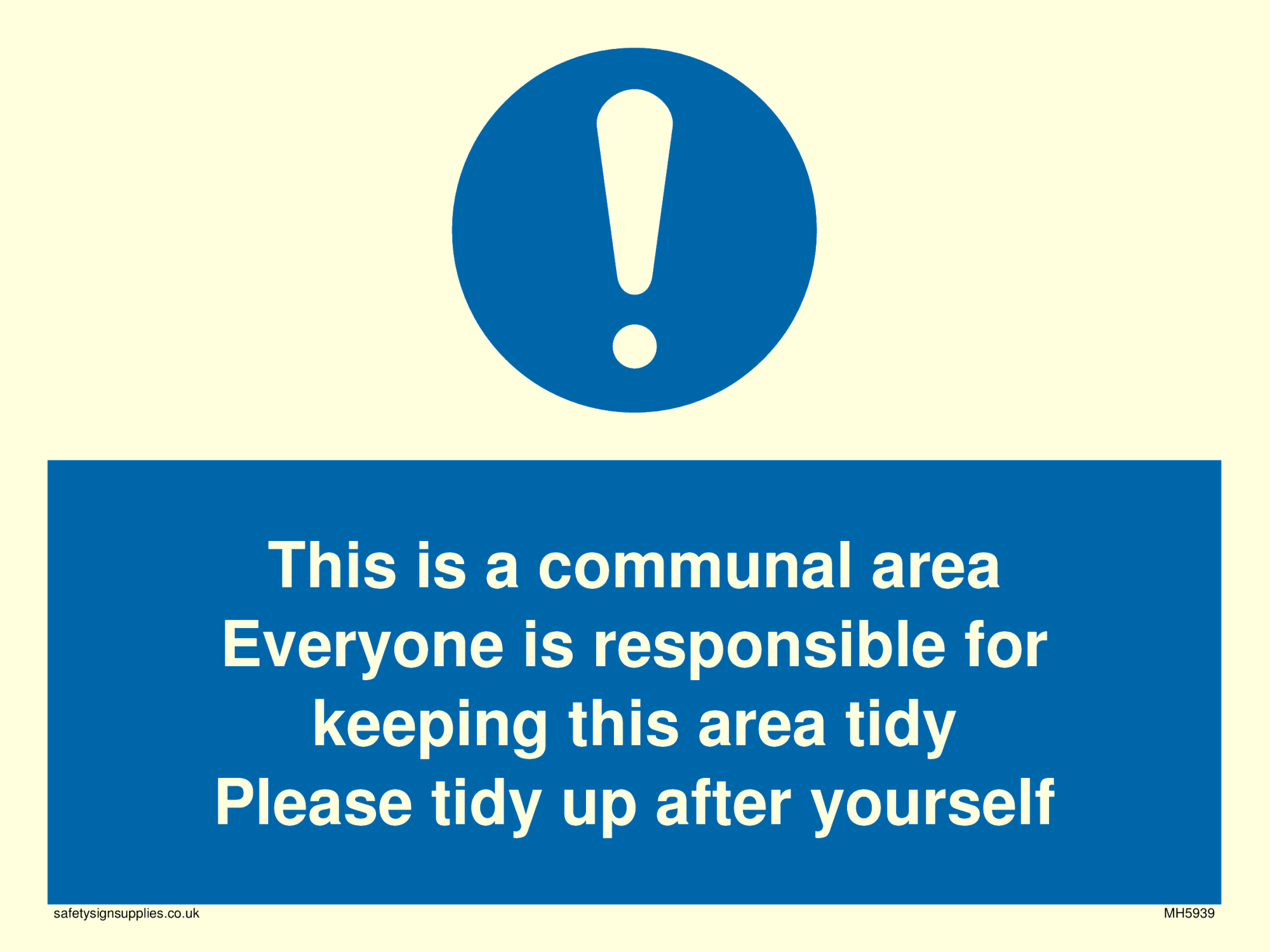 This sign contains a general Mandatory Exclamation Symbol - exclamation mark in white on blue circle background.