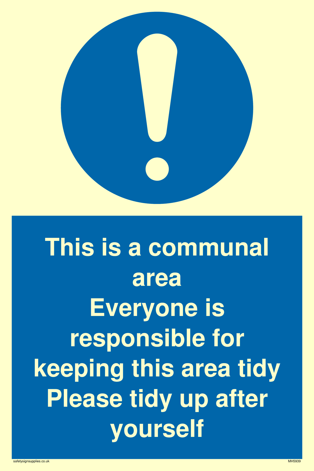 This sign contains a general Mandatory Exclamation Symbol - exclamation mark in white on blue circle background.
