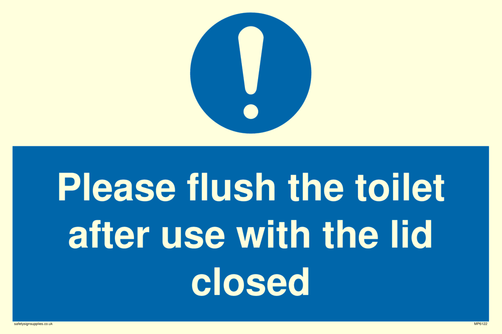 This sign contains a general Mandatory Exclamation Symbol - exclamation mark in white on blue circle background.