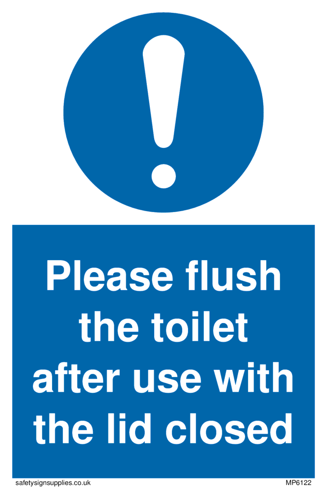 This sign contains a general Mandatory Exclamation Symbol - exclamation mark in white on blue circle background.