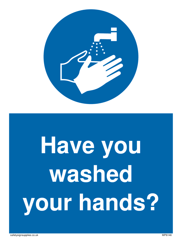 This sign contains a wash hands symbol - person washing hands under running tap in white within blue circle.