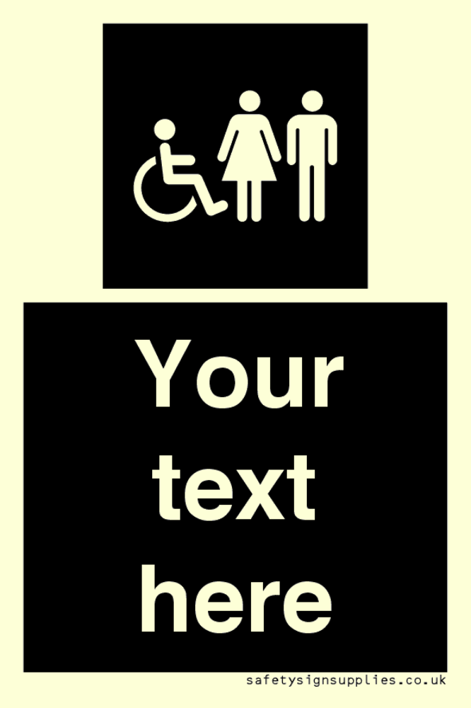 Thickness / Depth: 170microns Durability: 3-5 years Mounting Surface: Window / Glass Materials: Sticker Material Colour: Glow in the Dark Language: ENGLISH Language (EN) Symbol: I046 : Disabled, Female and Male in black panel Internal Layout: 1PA : 1 portrait pod in a Portrait Unit Dimension: 50x75mm Region: UK