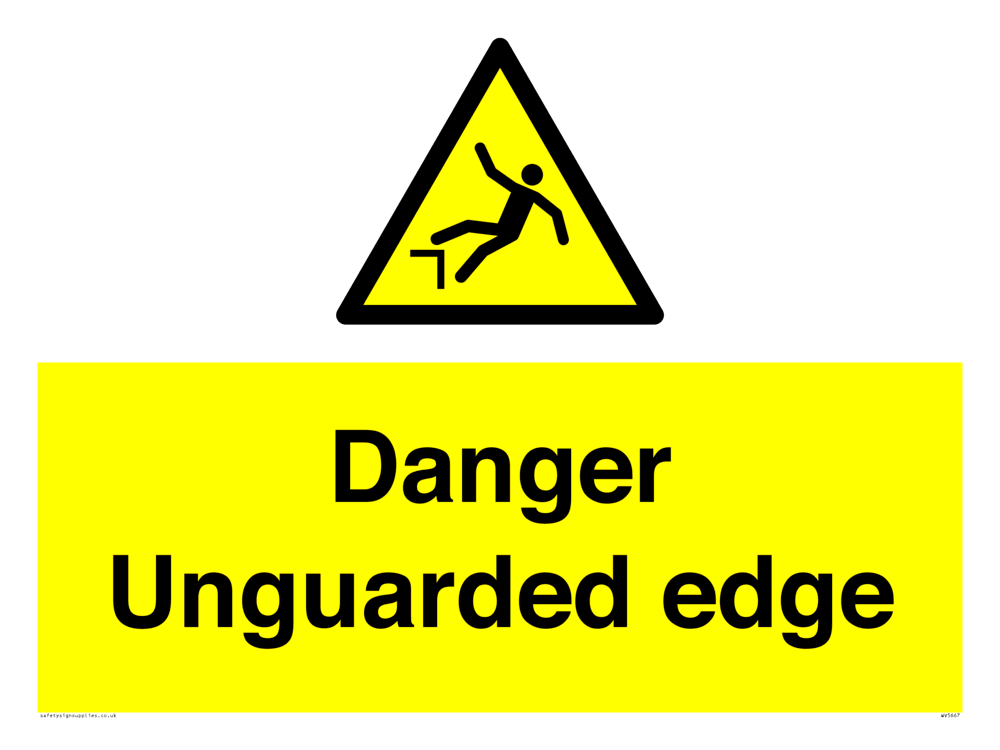 This sign contains a drop warning symbol. Person falling off drop in black on a yellow warning triangle with a black border.
