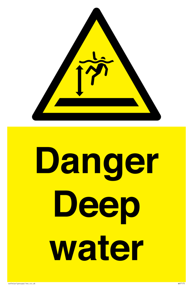 This sign contains a deep water warning symbol. Person standing next to drop into deep water in black on yellow warning triangle with black border.