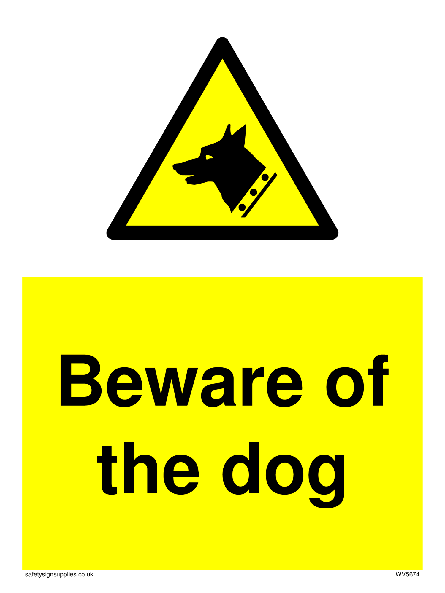 This sign contains a guard dog warning symbol. Guard dog in black on yellow warning triangle with black border.