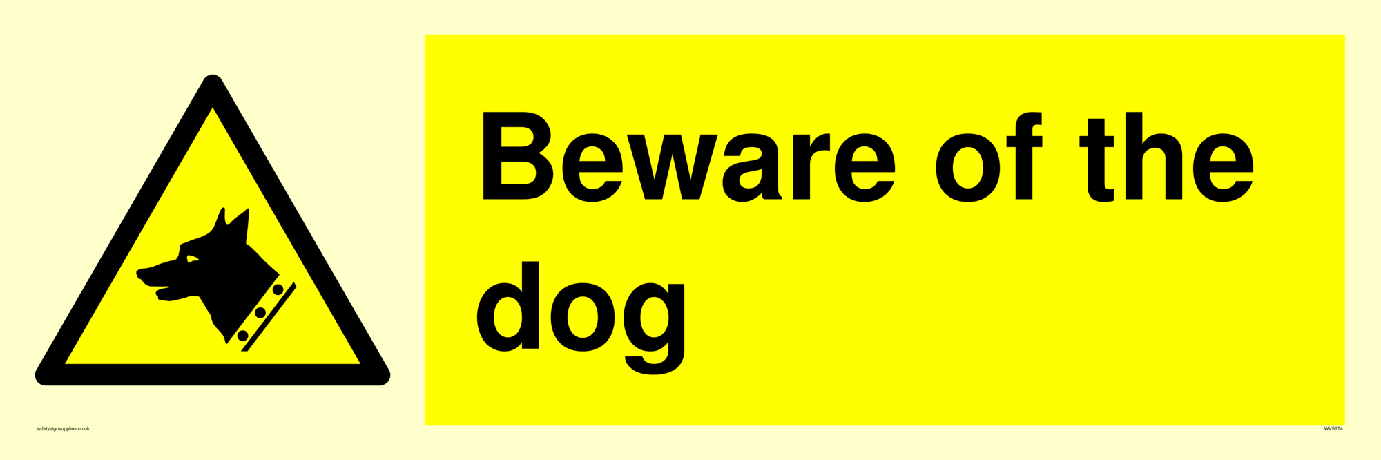 This sign contains a guard dog warning symbol. Guard dog in black on yellow warning triangle with black border.