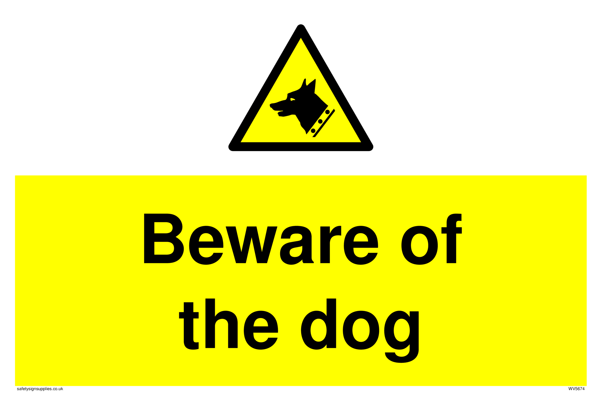 This sign contains a guard dog warning symbol. Guard dog in black on yellow warning triangle with black border.