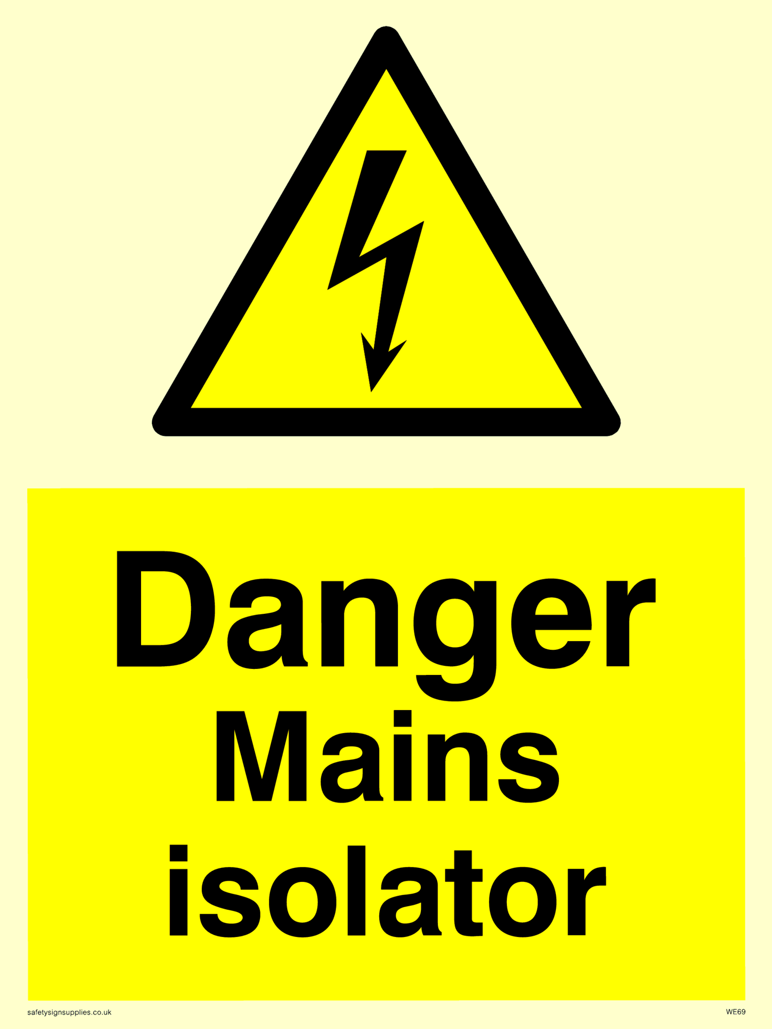 This sign contains an electrical warning symbol. Lightning flash in black on yellow warning triangle with black border.