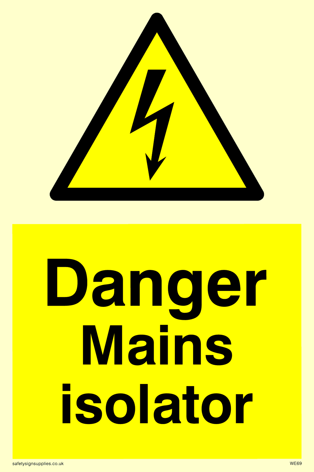 This sign contains an electrical warning symbol. Lightning flash in black on yellow warning triangle with black border.