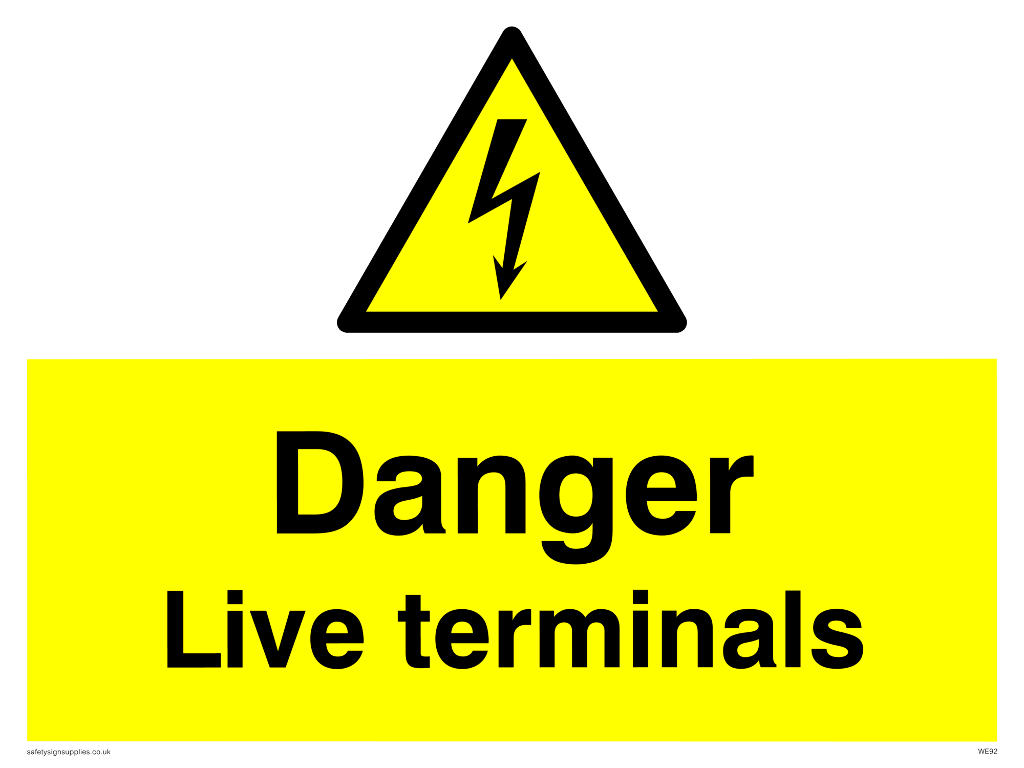 This sign contains an electrical warning symbol. Lightning flash in black on yellow warning triangle with black border.