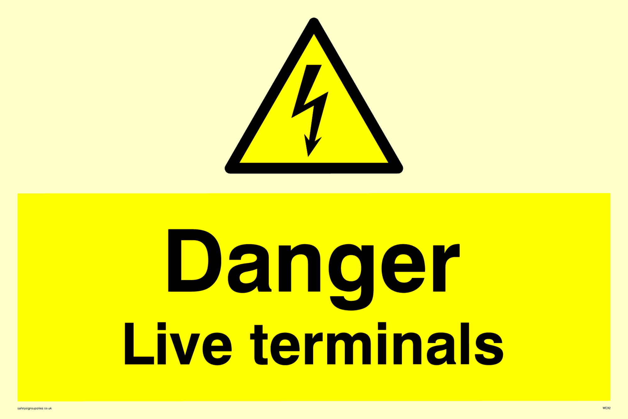 This sign contains an electrical warning symbol. Lightning flash in black on yellow warning triangle with black border.