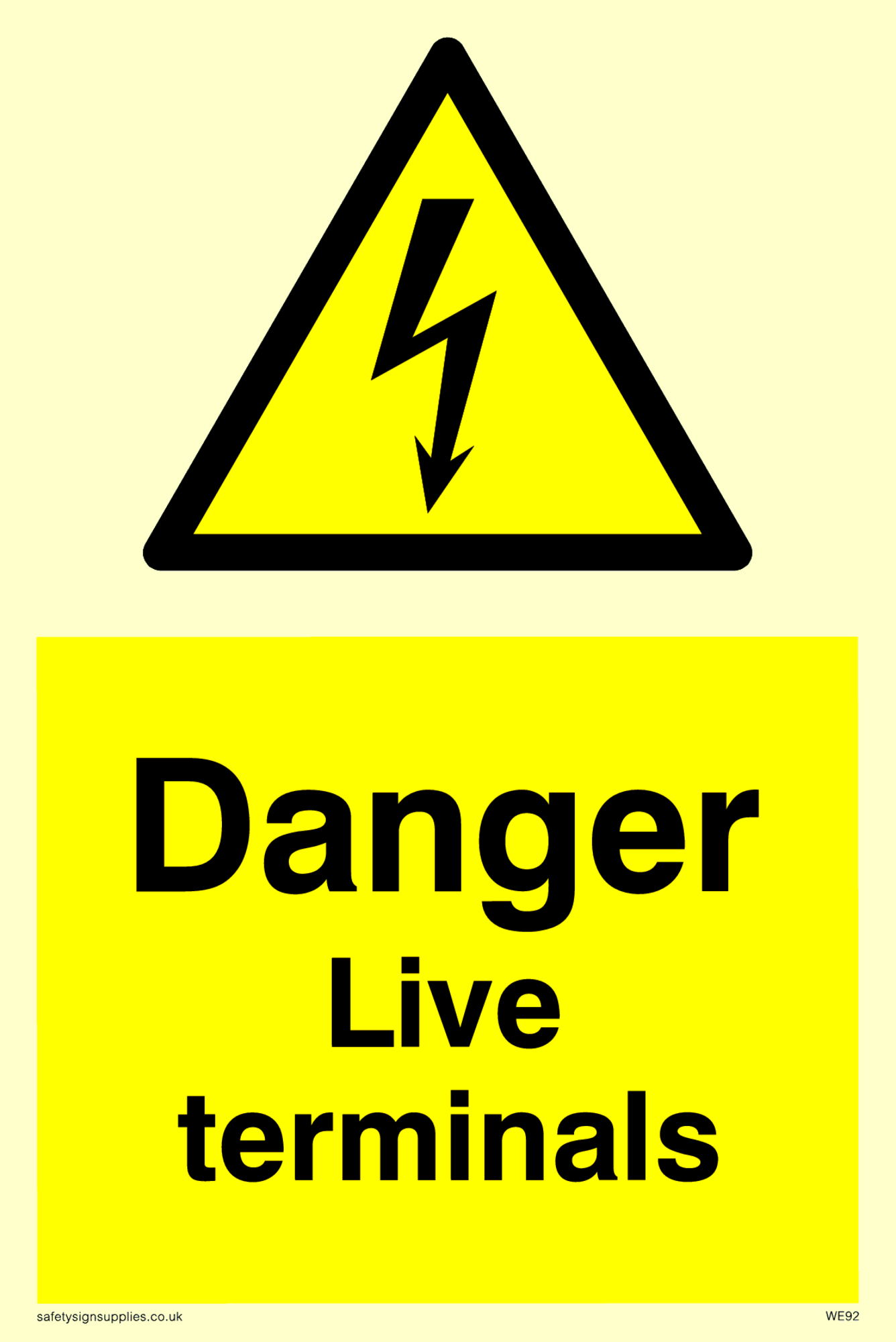 This sign contains an electrical warning symbol. Lightning flash in black on yellow warning triangle with black border.