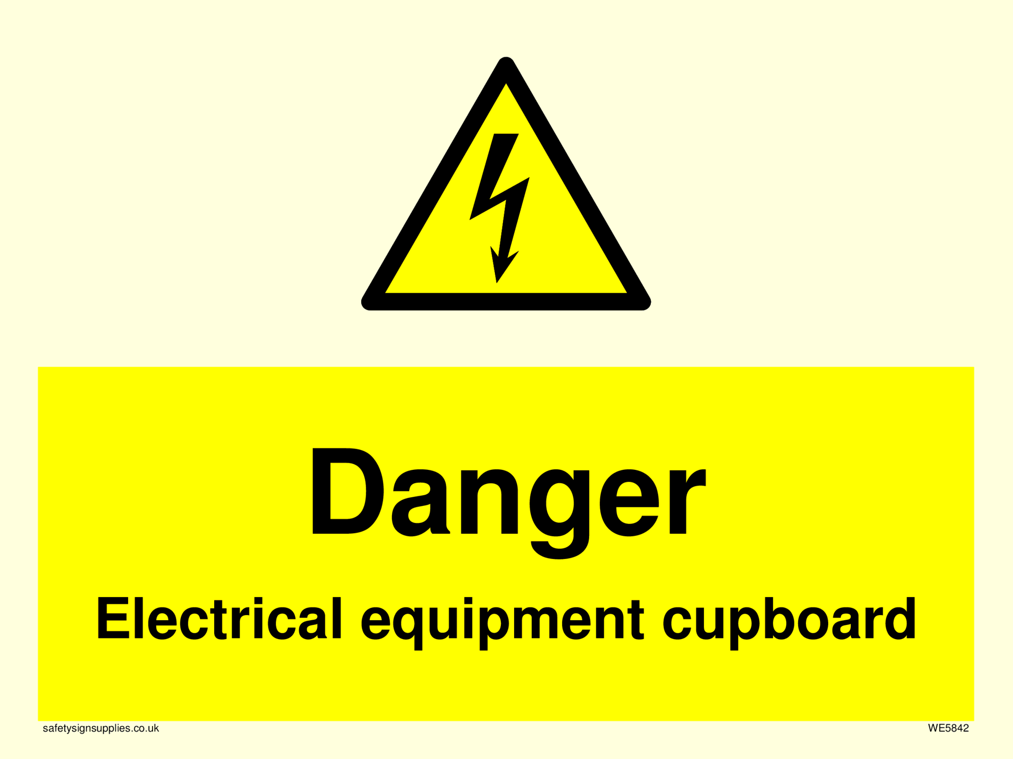 Sign Text: Danger Electrical equipment cupboard with electrical hazard warning symbol