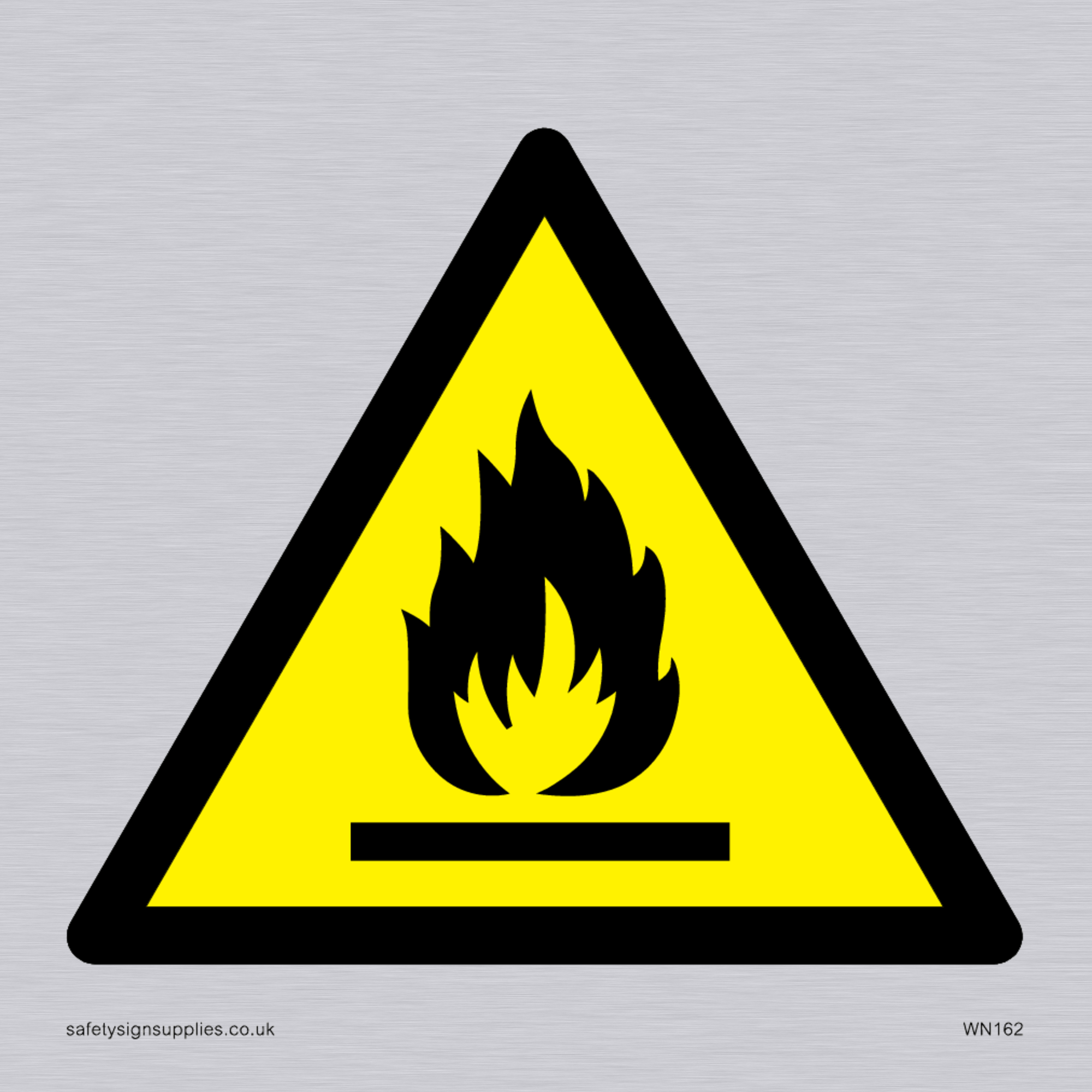 The background of this sign is the colour of the base material. This sign contains an international standard flammable warning symbol. flat bar with flames in black on a yellow warning triangle with a black border.