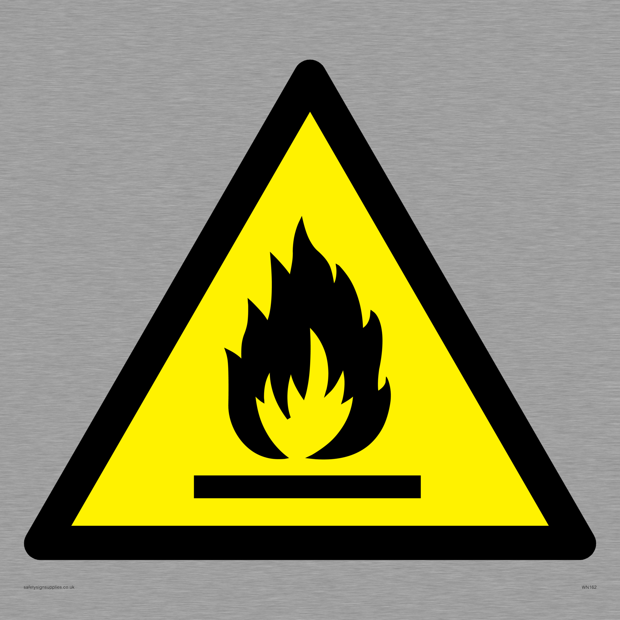 This sign contains an international standard flammable warning symbol. flat bar with flames in black on a yellow warning triangle with a black border.