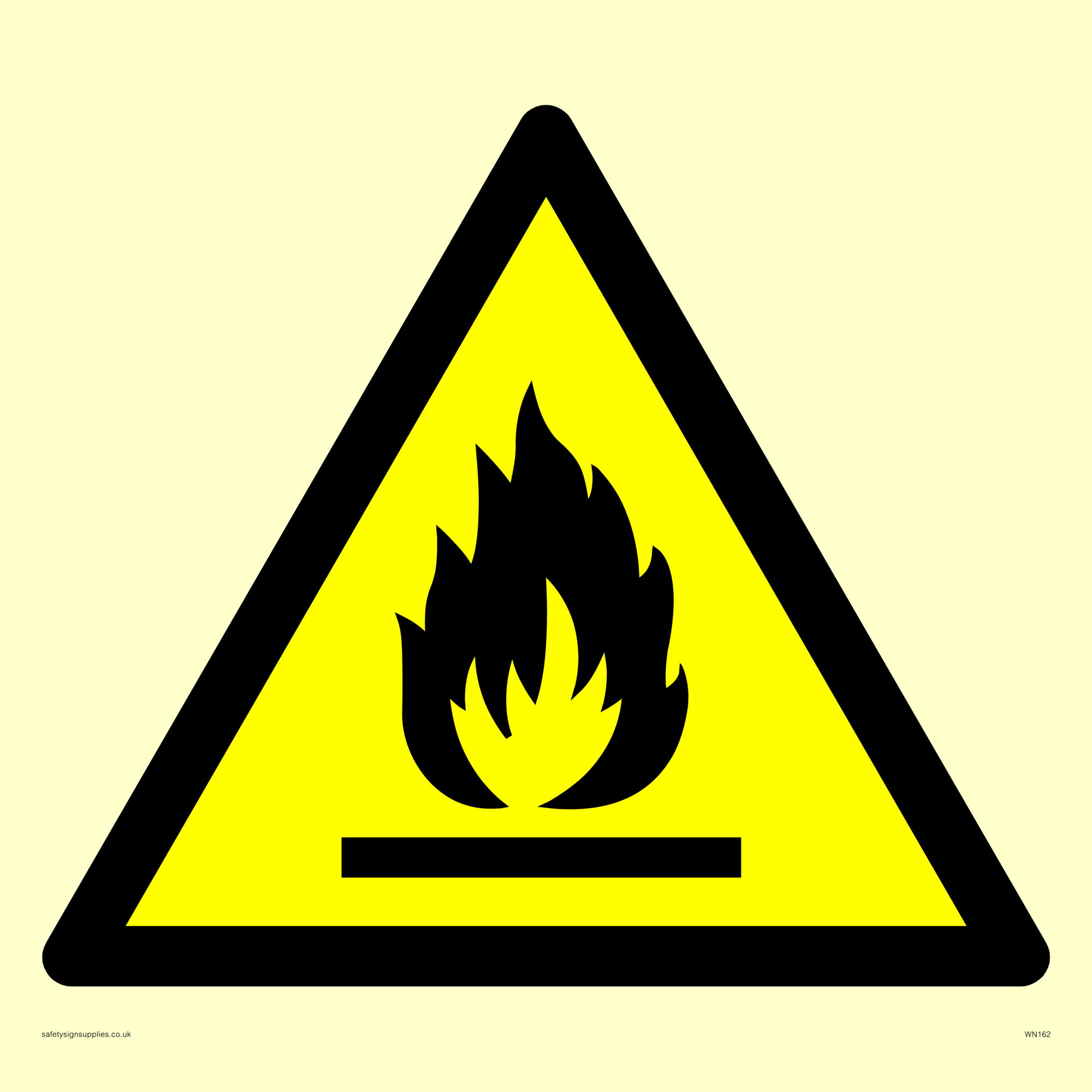 This sign contains an international standard flammable warning symbol. flat bar with flames in black on a yellow warning triangle with a black border. Comes with a self adhesive backing.