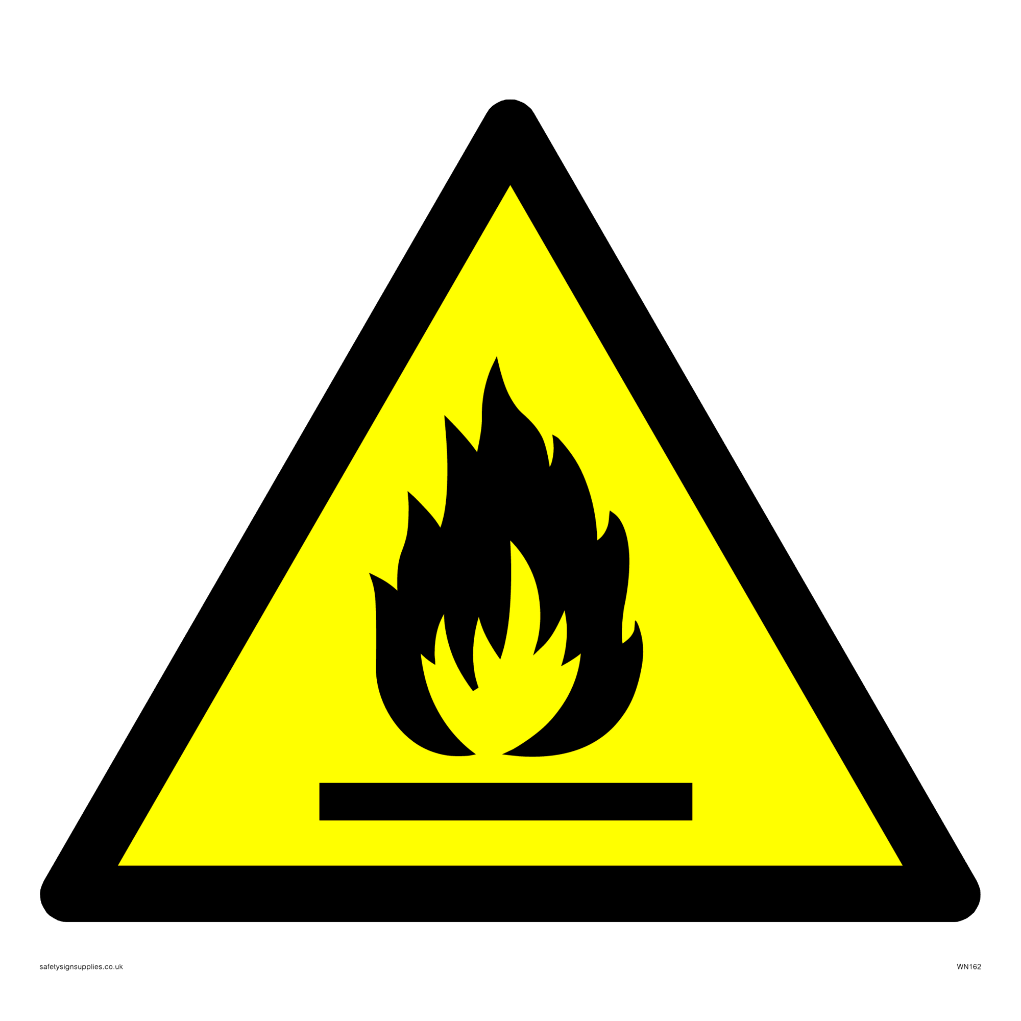 This sign contains an international standard flammable warning symbol. flat bar with flames in black on a yellow warning triangle with a black border.