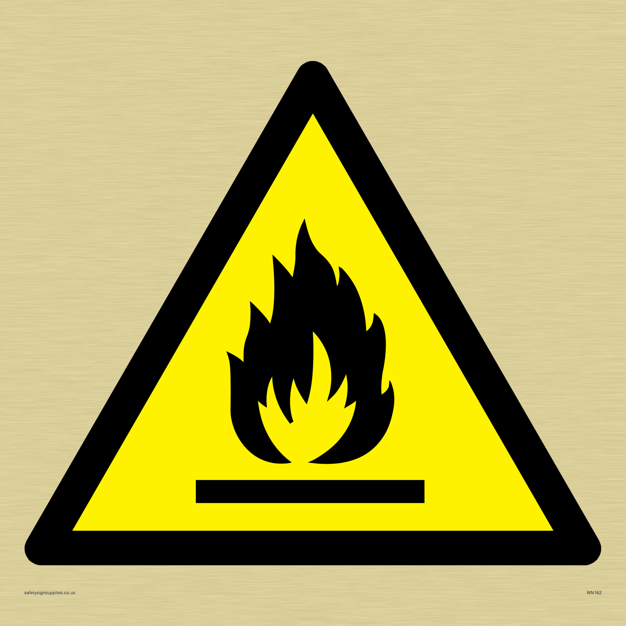 The background of this sign is the colour of the base material. This sign contains an international standard flammable warning symbol. flat bar with flames in black on a yellow warning triangle with a black border.