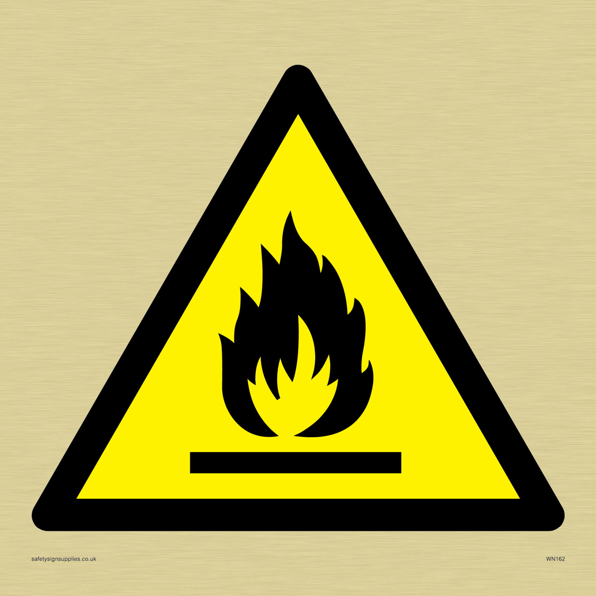 This sign contains an international standard flammable warning symbol. flat bar with flames in black on a yellow warning triangle with a black border.