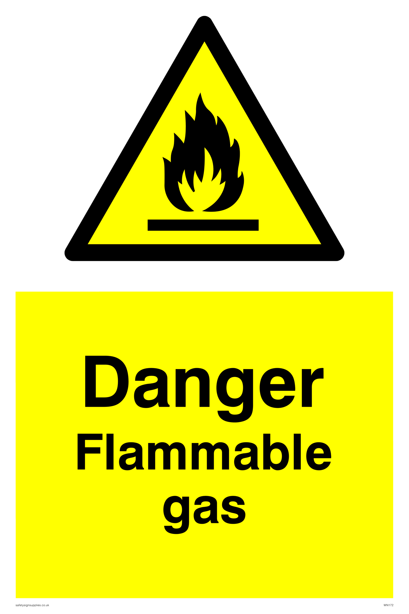 This sign contains an international standard flammable warning symbol. flat bar with flames in black on a yellow warning triangle with a black border.