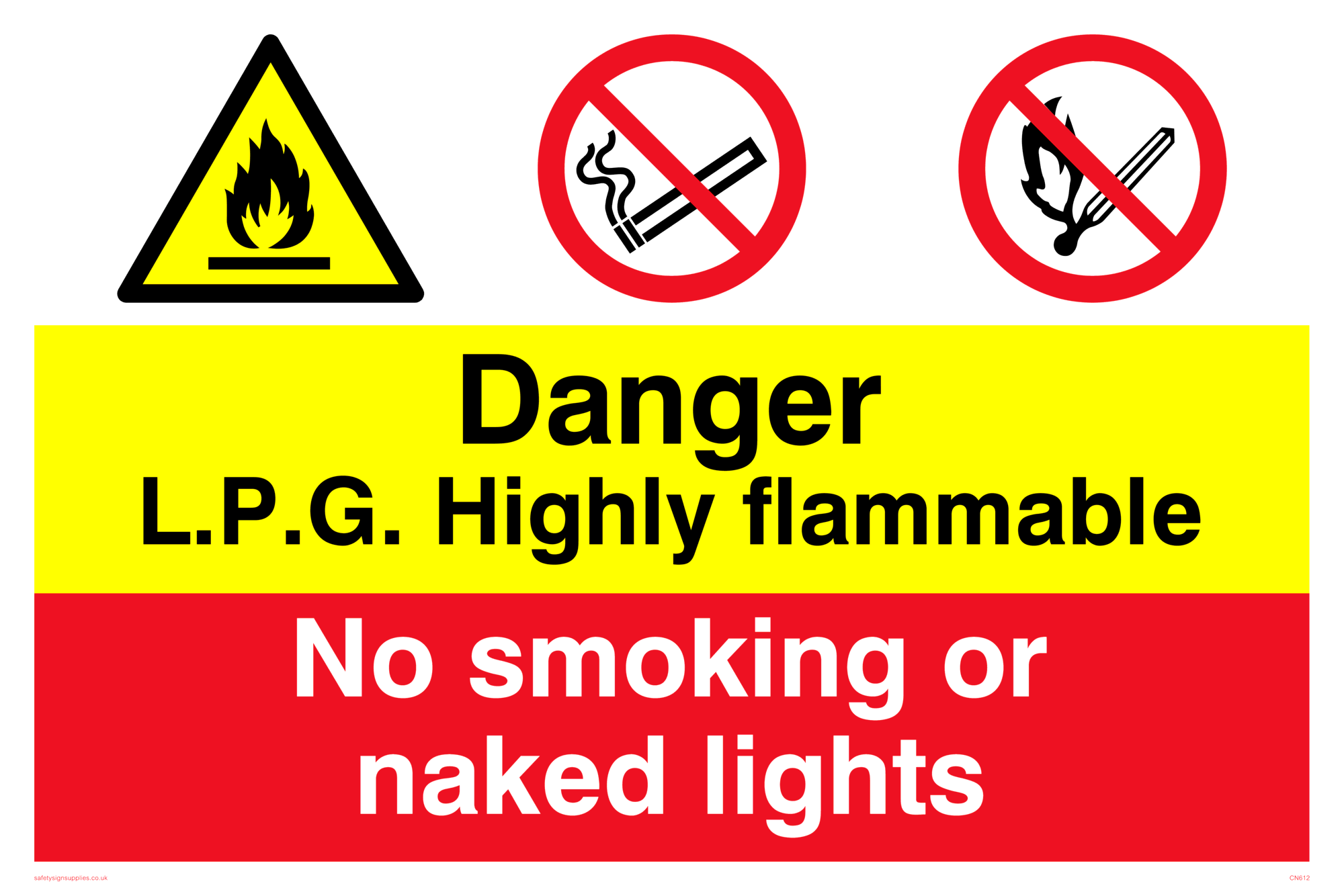 Smoking signs indicate when and where you can or cannot smoke. Chemical / Substance signs are used to indicate actions or health risks due to chemicals. A combination sign combines several safety sign types on one sign. LPG / Gas signs concern the use or storage of LPG (L.P.G.) or other flammable gases and posionous gaseous substances.