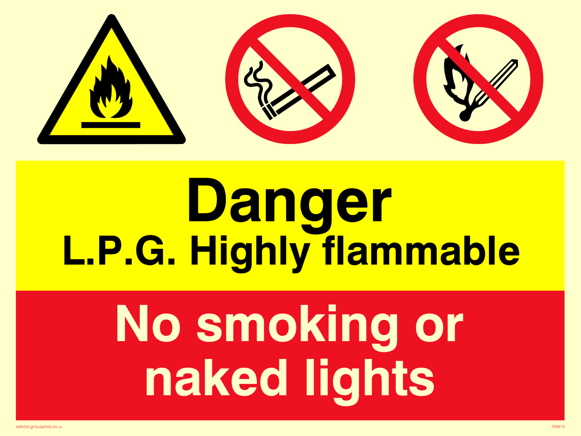 LPG / Gas signs concern the use or storage of LPG (L.P.G.) or other flammable gases and posionous gaseous substances. A combination sign combines several safety sign types on one sign. Smoking signs indicate when and where you can or cannot smoke. Chemical / Substance signs are used to indicate actions or health risks due to chemicals. This sign is small.