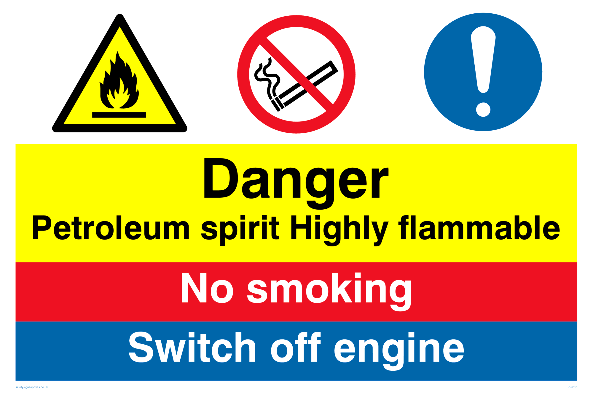 A combination sign combines several safety sign types on one sign. Vehicle signs are used on vehicles, or in an environment where vehicles are used. Smoking signs indicate when and where you can or cannot smoke. This sign is approximately equivalent to A4 paper size. This sign is medium sized.