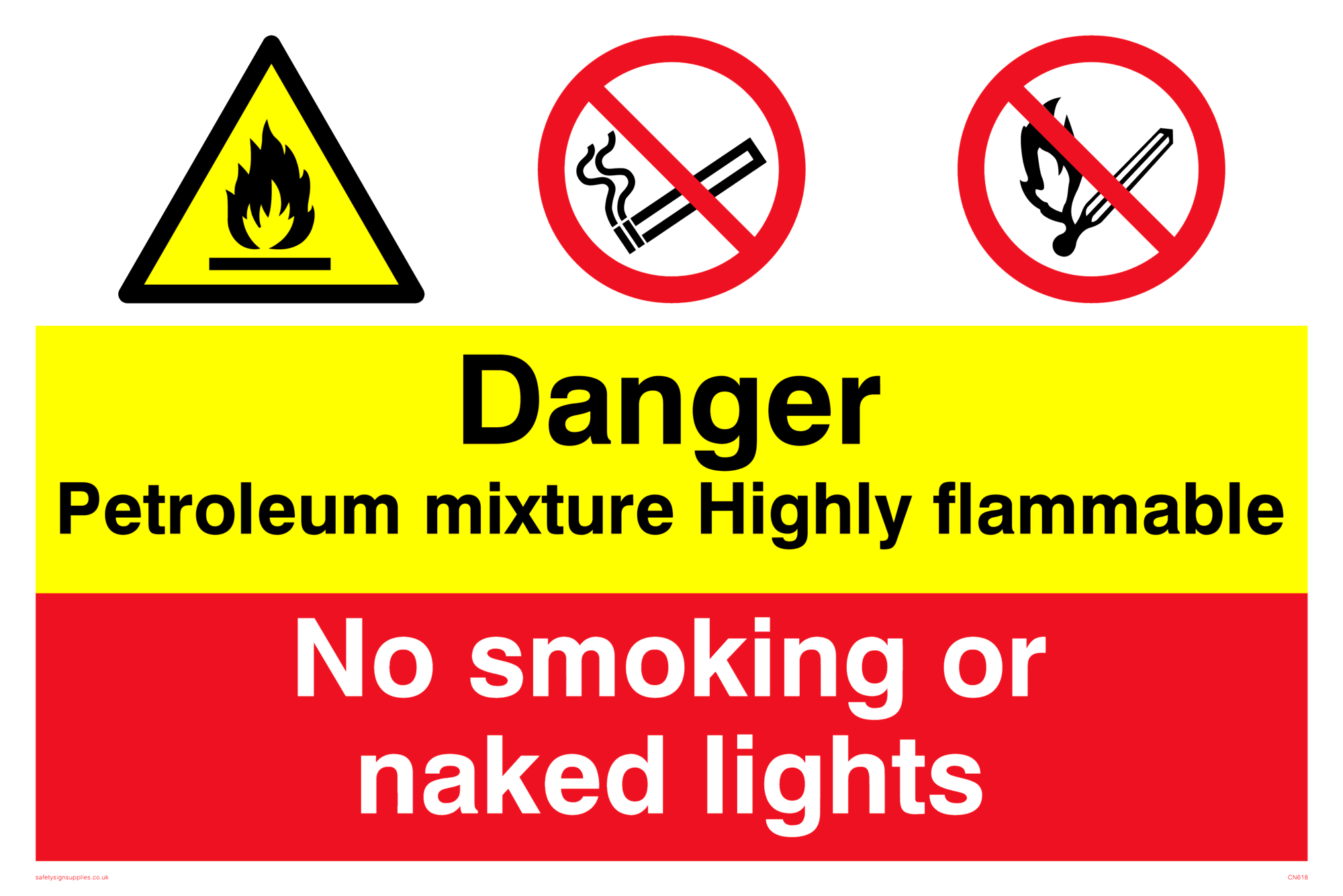 This sign contains a no naked lights symbol - match in black with red prohibition circle crossed through with diagonal line.