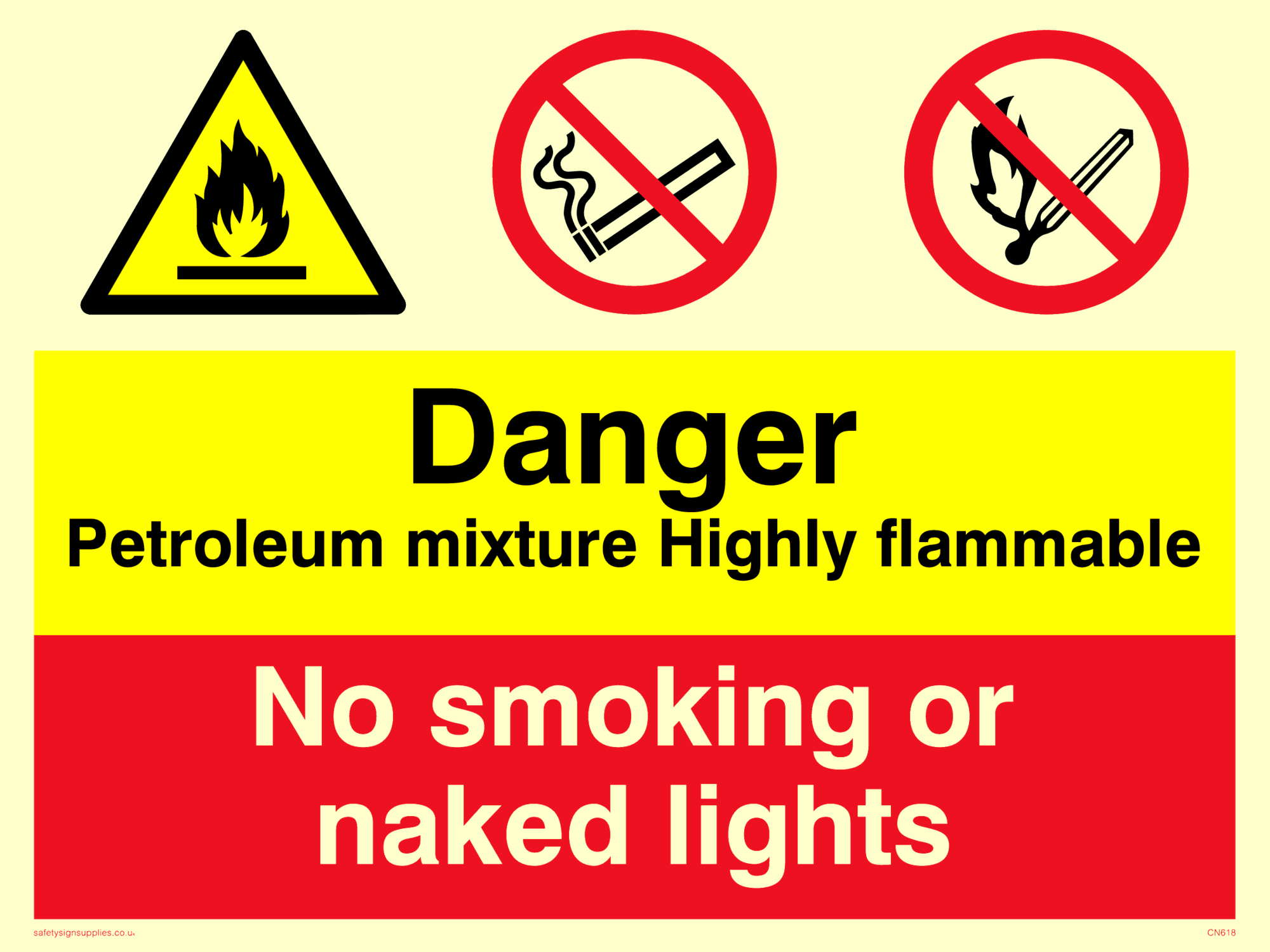 This sign contains a no naked lights symbol - match in black with red prohibition circle crossed through with diagonal line.