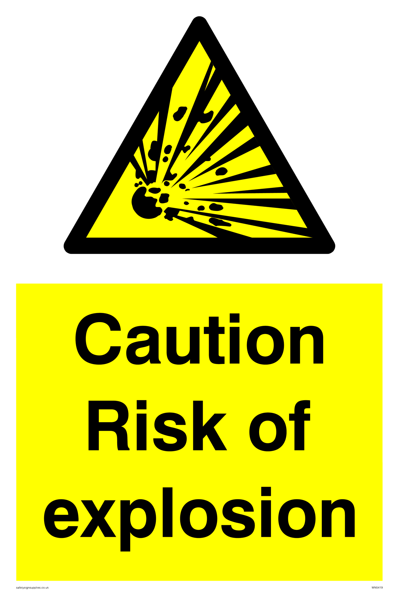 This sign contains an international standard explosive symbol. Point source with explosion in black on yellow warning triangle with black border.