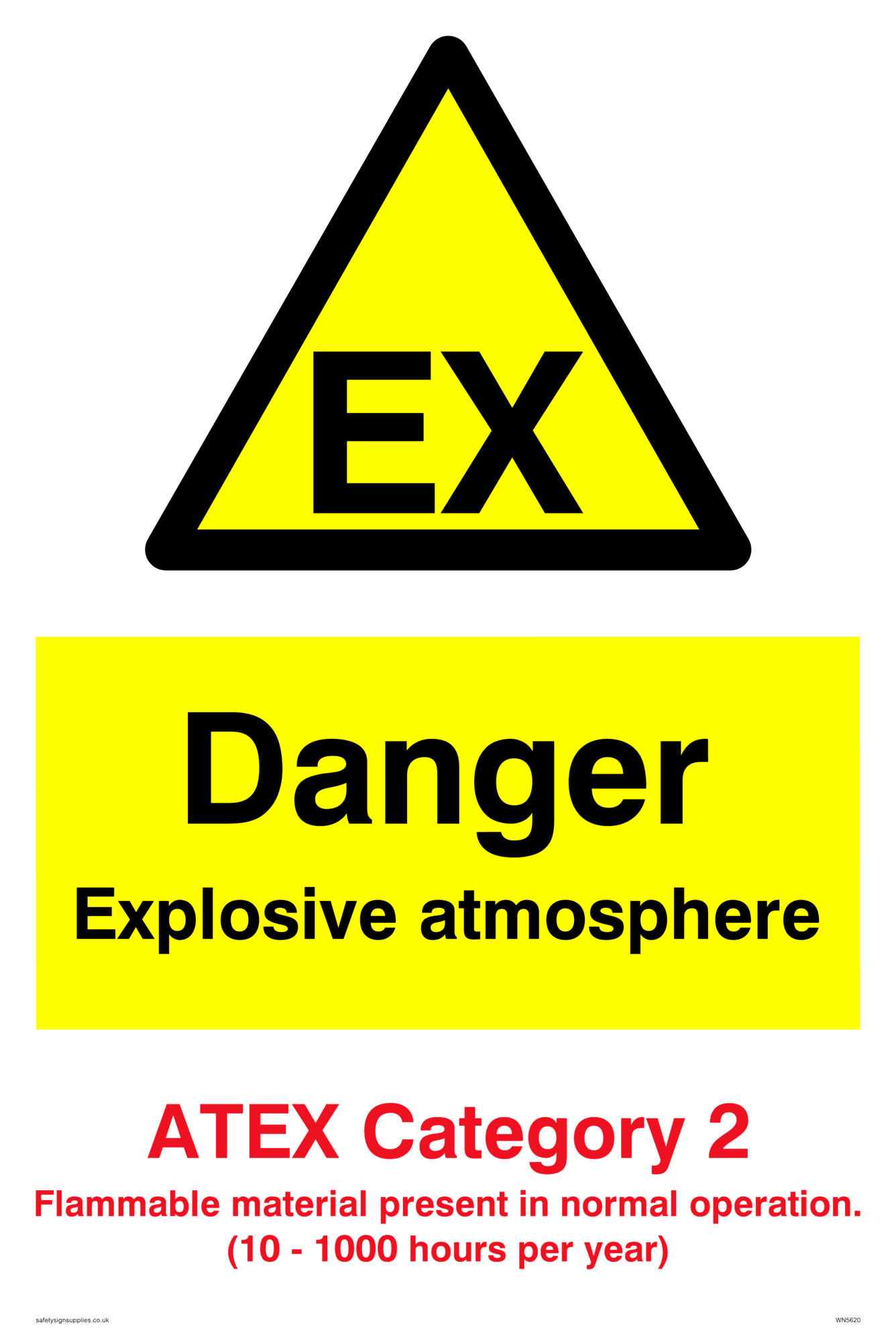This sign features an Explosive Atmosphere warning symbol, Black text "EX" in a yellow triangle with black border.