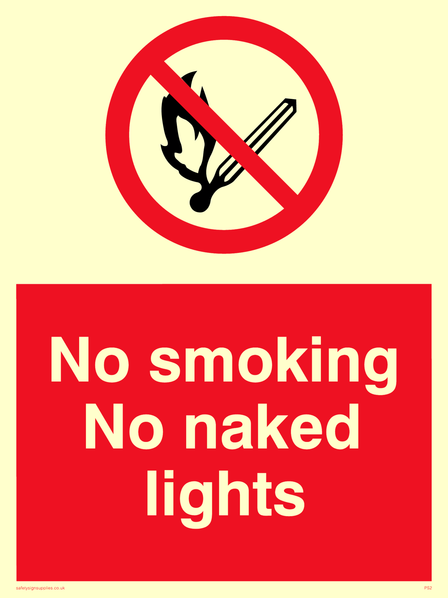This sign contains a no naked lights symbol - match in black with red prohibition circle crossed through with diagonal line.
