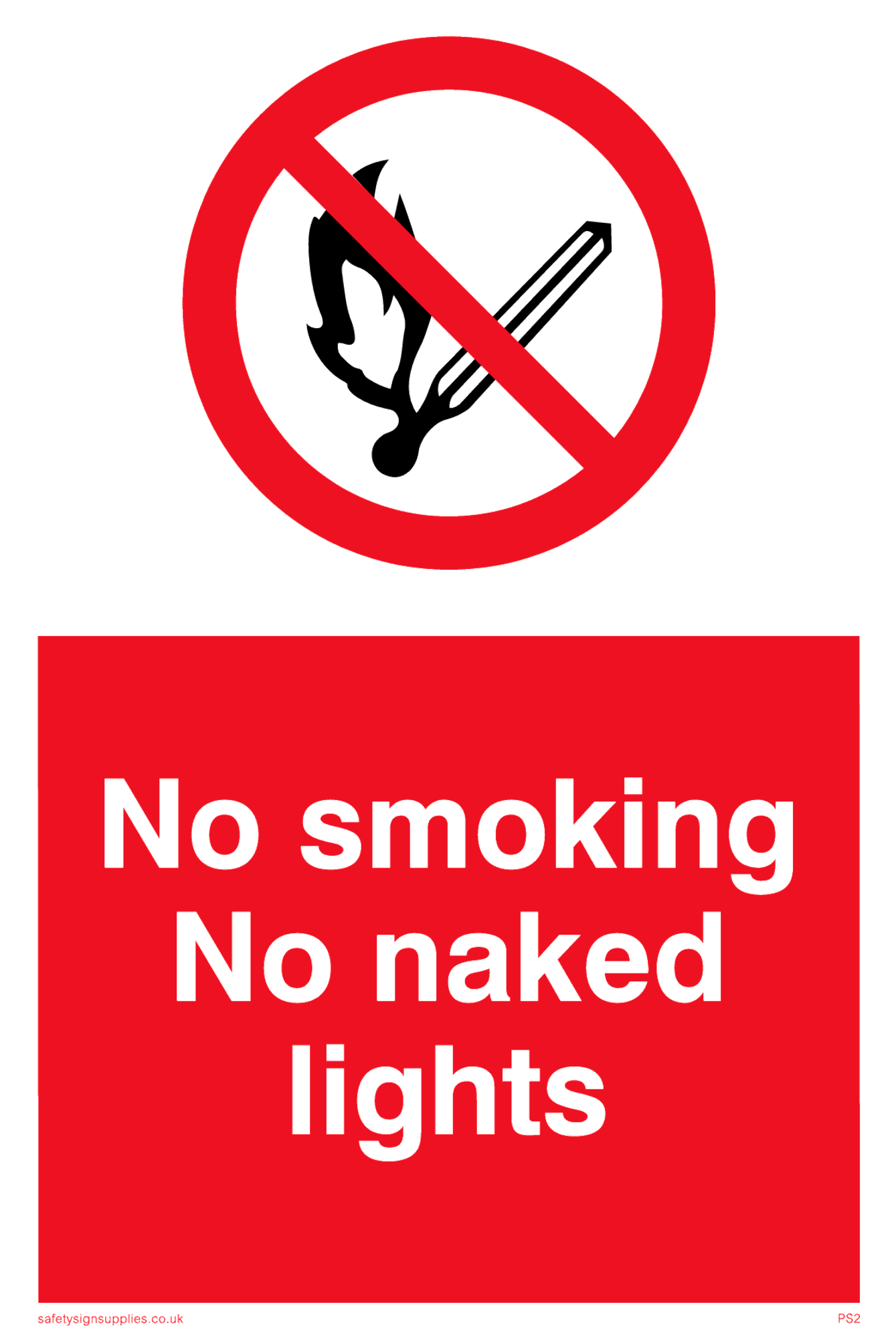 This sign contains a no naked lights symbol - match in black with red prohibition circle crossed through with diagonal line.