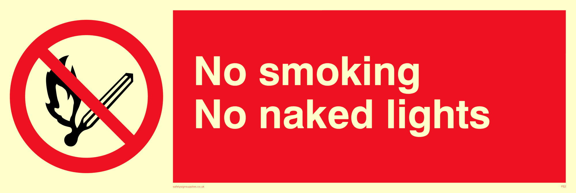 This sign contains a no naked lights symbol - match in black with red prohibition circle crossed through with diagonal line.