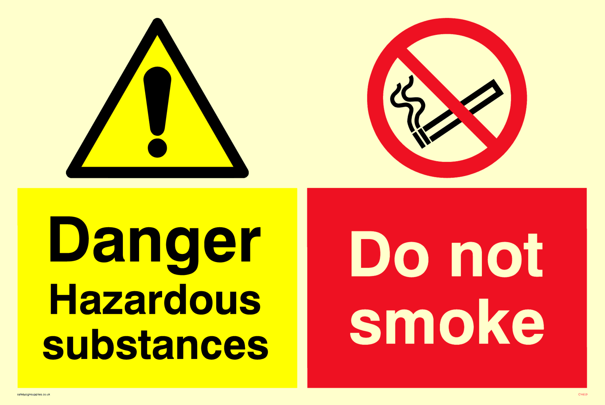 A combination sign combines several safety sign types on one sign. Health risk signs indicate and describe environmental risks to health. Smoking signs indicate when and where you can or cannot smoke. This sign is small. This sign is approximately equivalent to A6 paper size.