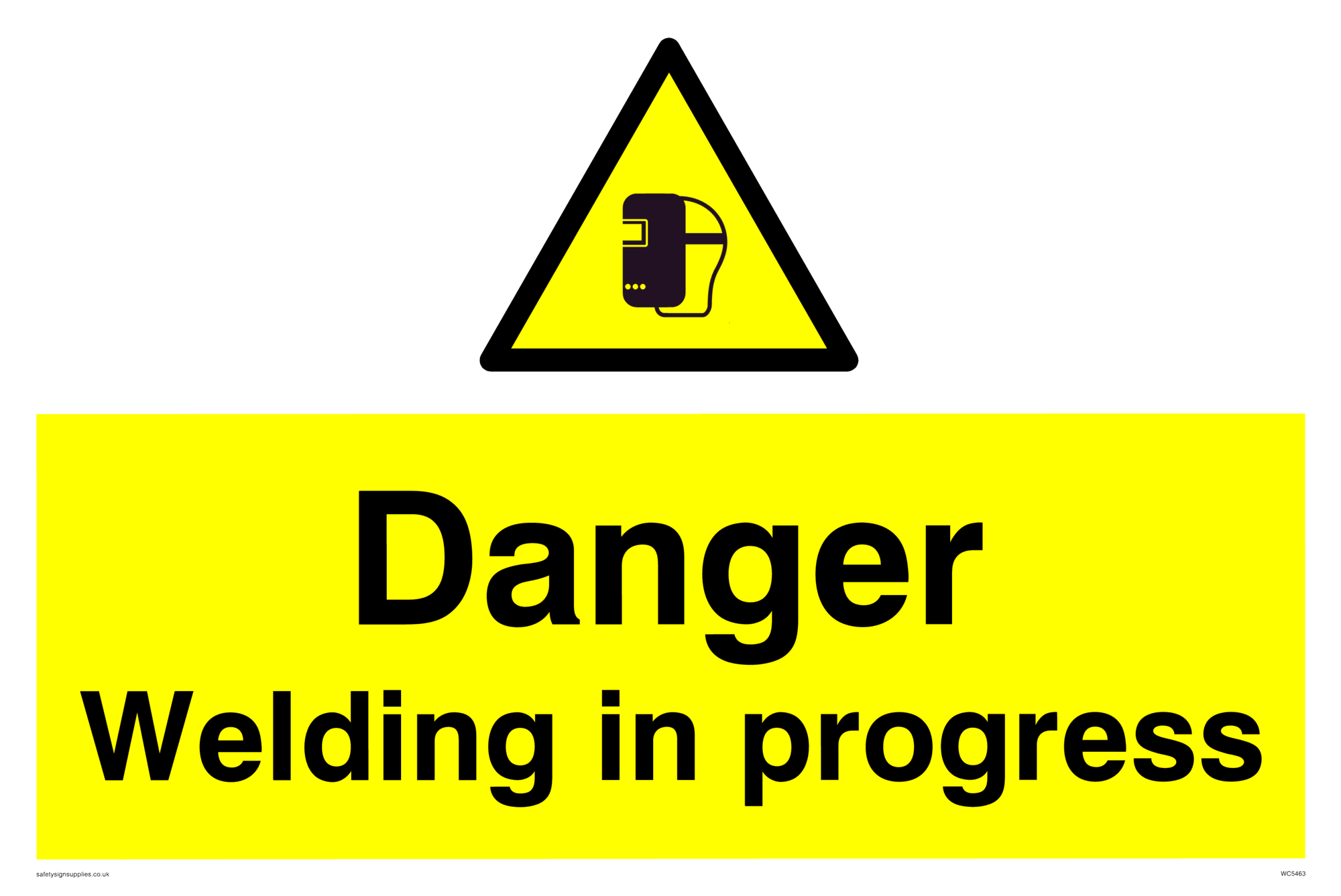 This sign contains a welding mask required symbol - person wearing a welding mask in white within blue circle. Suitable for fixing with screws.