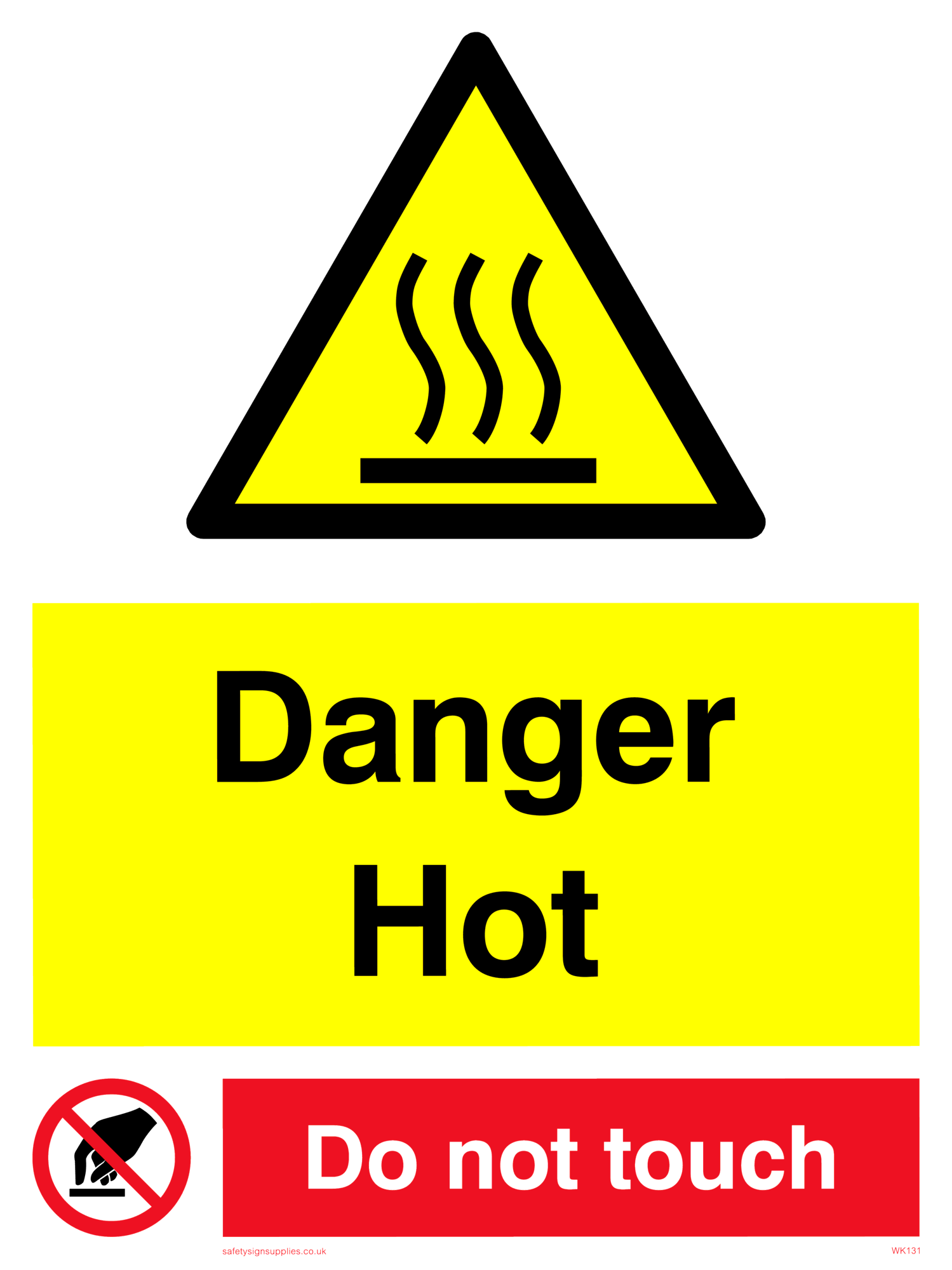 This sign contains a high temperature warning symbol. Wavy lines in black on yellow warning triangle with black border.