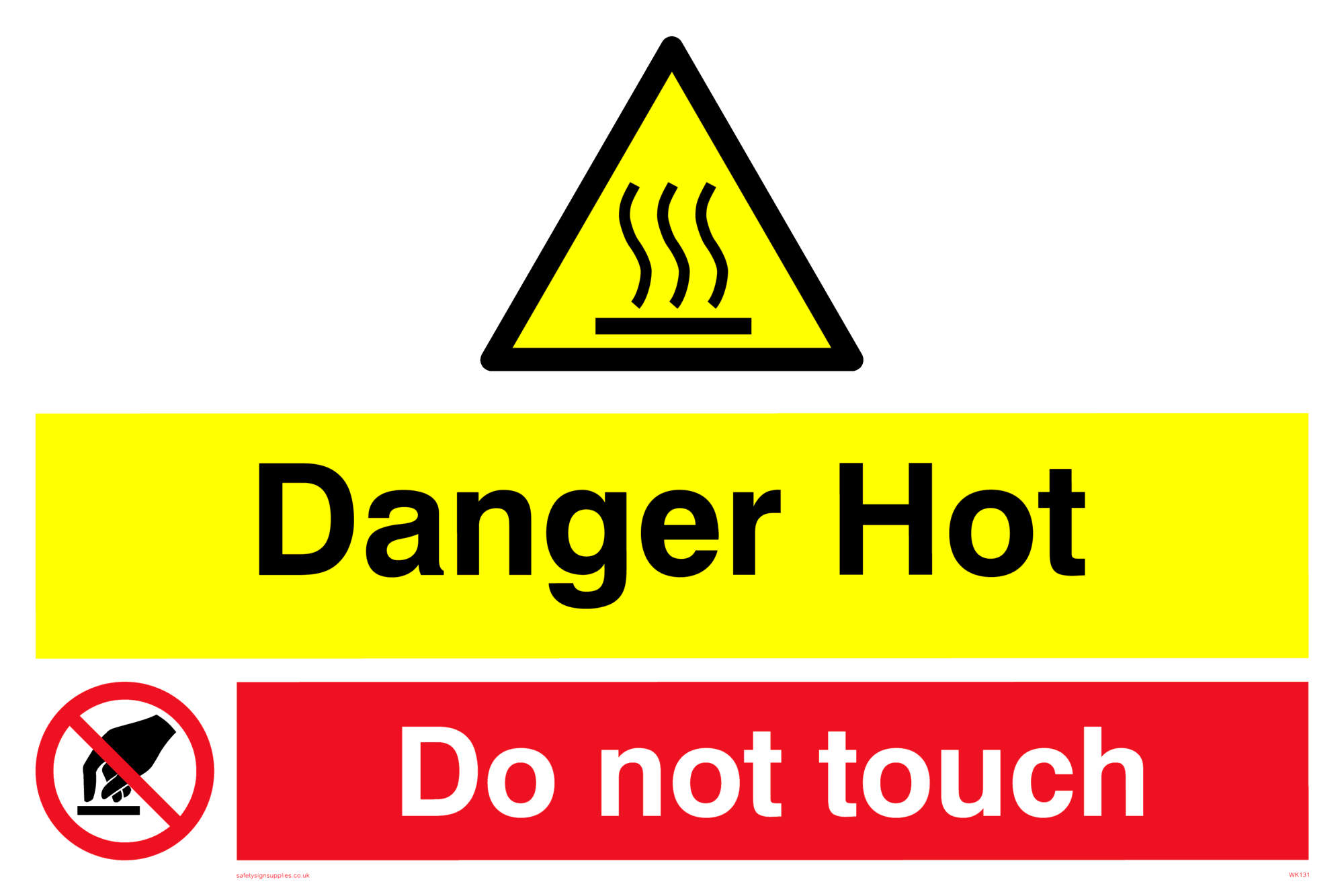 This sign contains a high temperature warning symbol. Wavy lines in black on yellow warning triangle with black border.