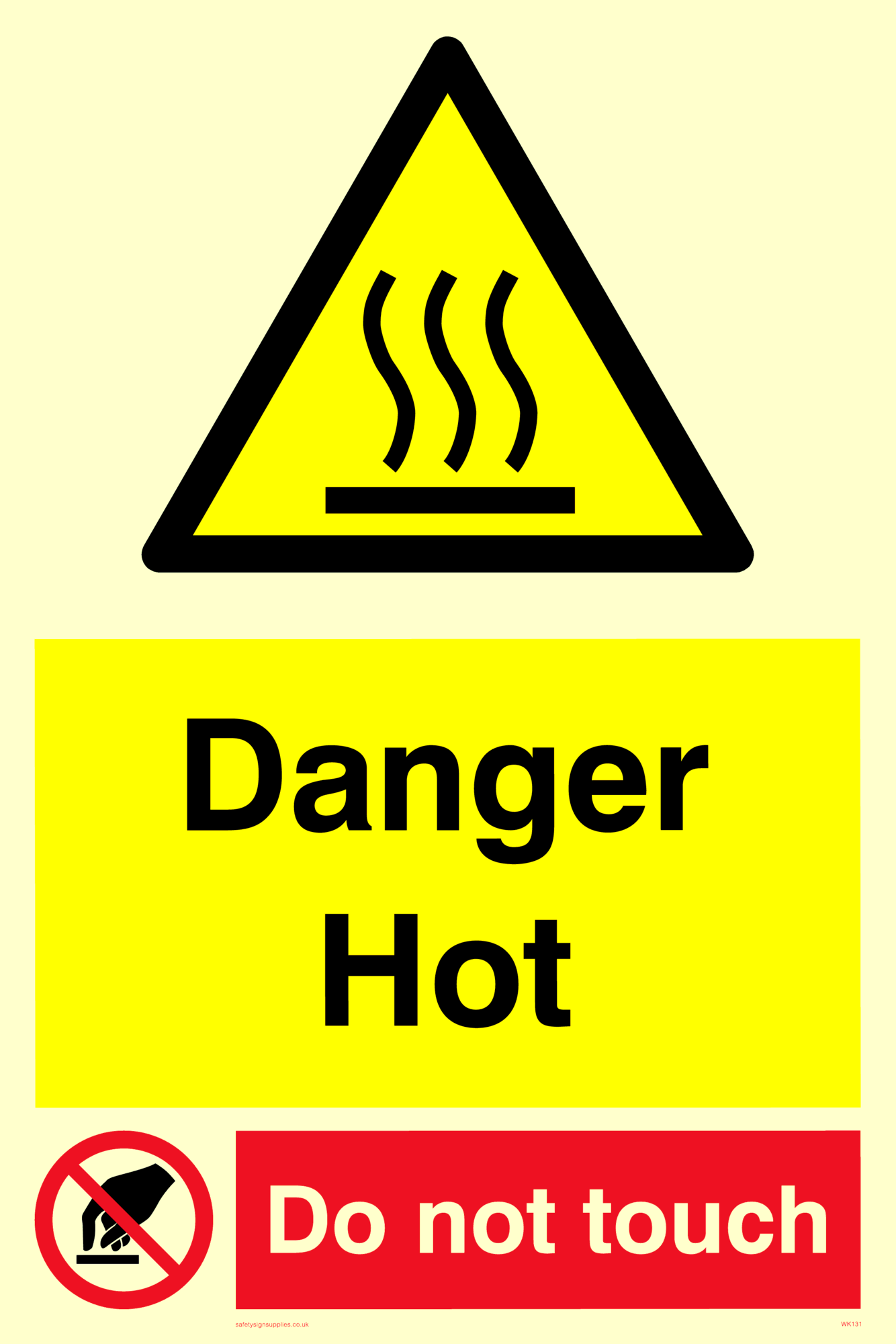 This sign contains a high temperature warning symbol. Wavy lines in black on yellow warning triangle with black border.