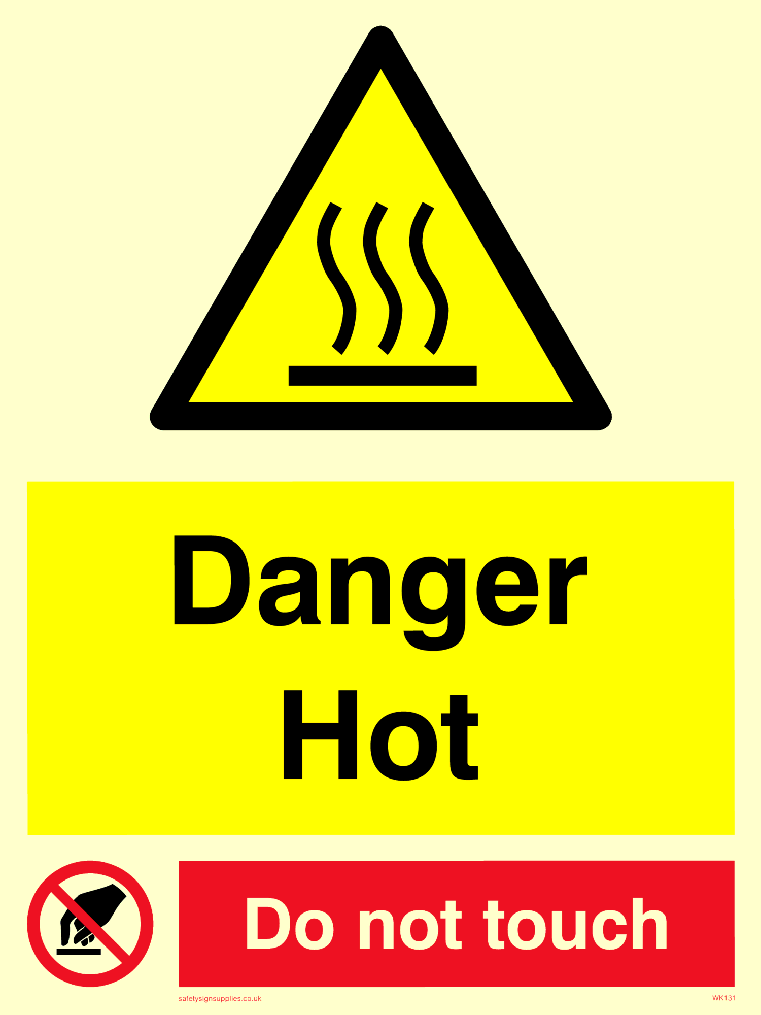 This sign contains a high temperature warning symbol. Wavy lines in black on yellow warning triangle with black border.