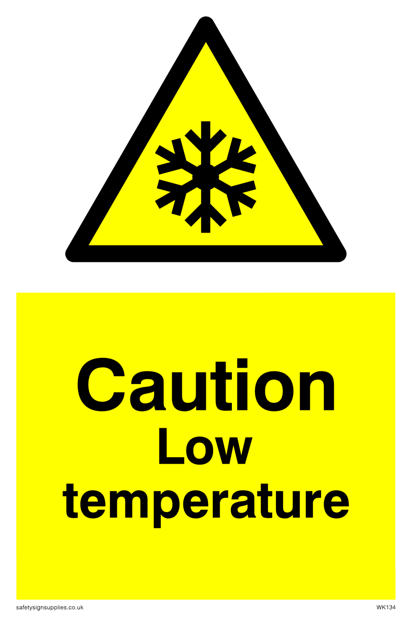 This signs contains a low temperature warning symbol. Snowflake symbol in black