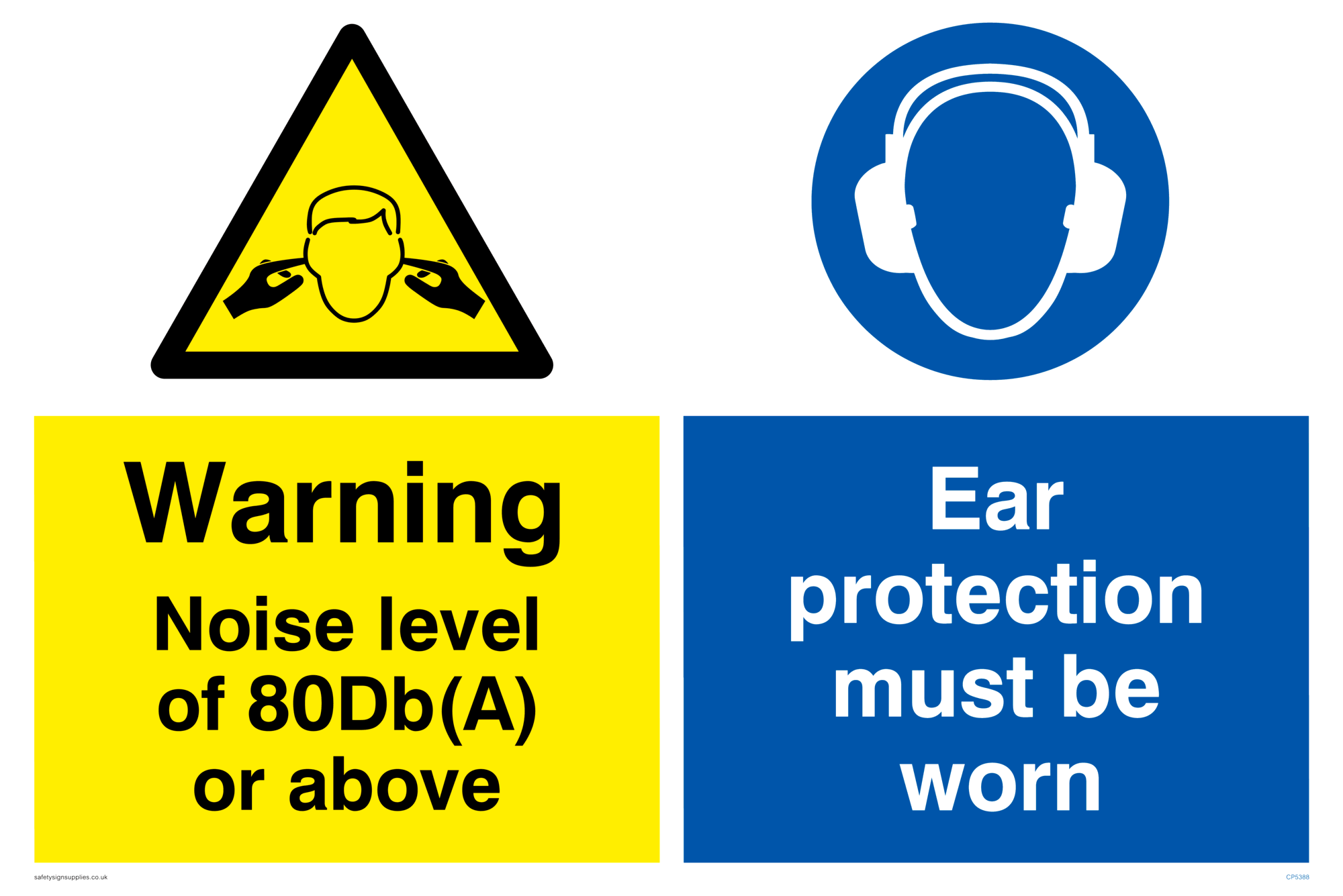This sign contains an ear protection required symbol - person wearing ear defenders in white within blue circle.