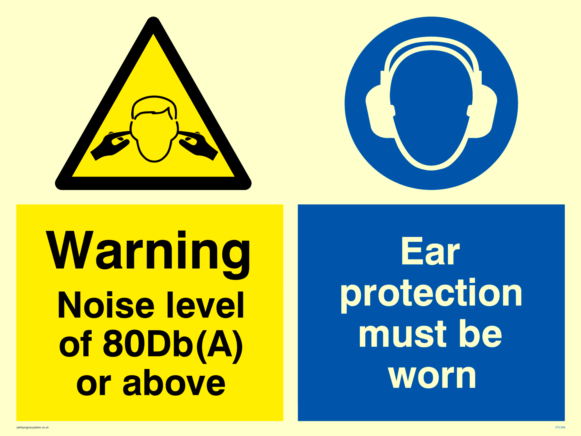 This sign contains a standard noise hazard symbol. Person with fingers in their ears in black on yellow warning triangle with black border.